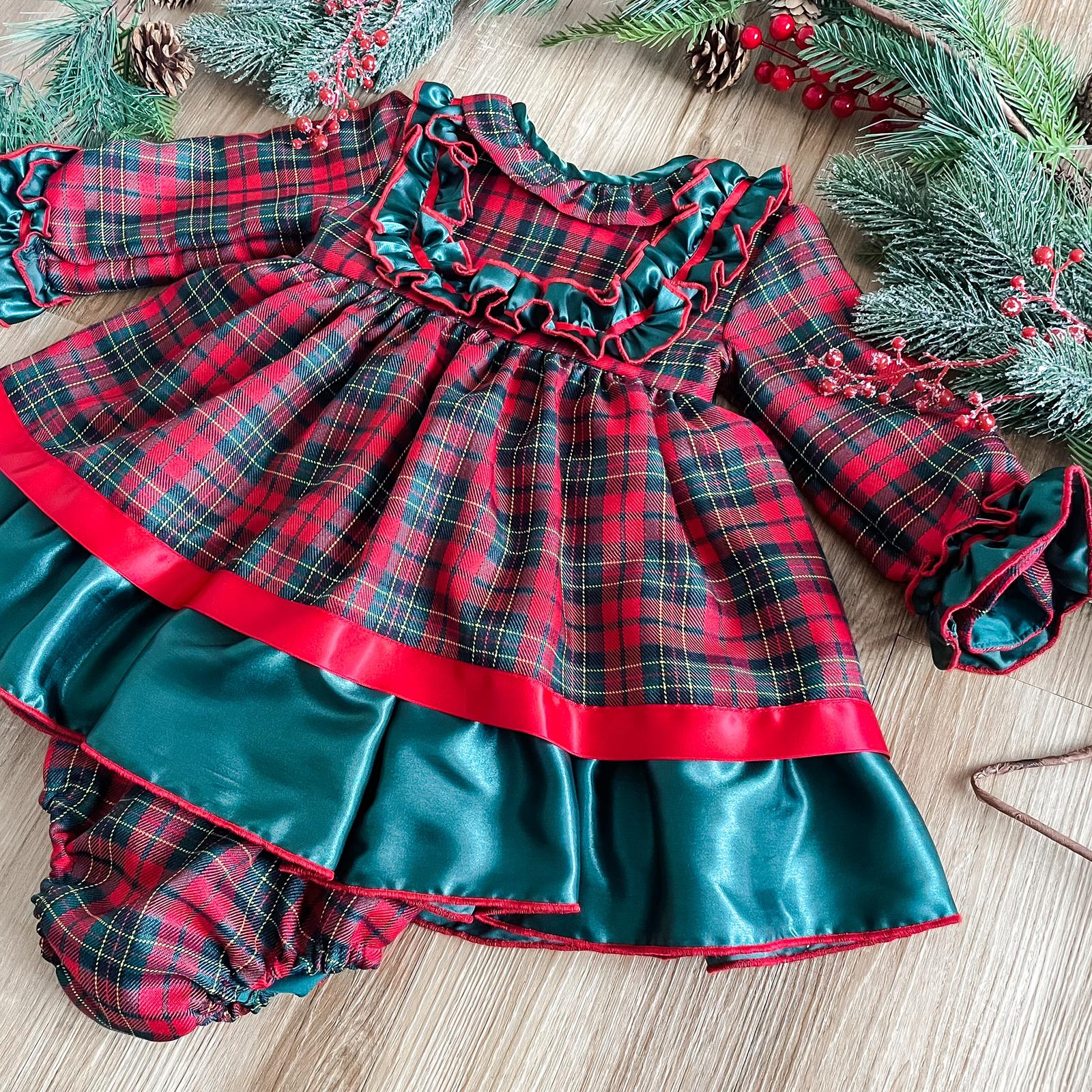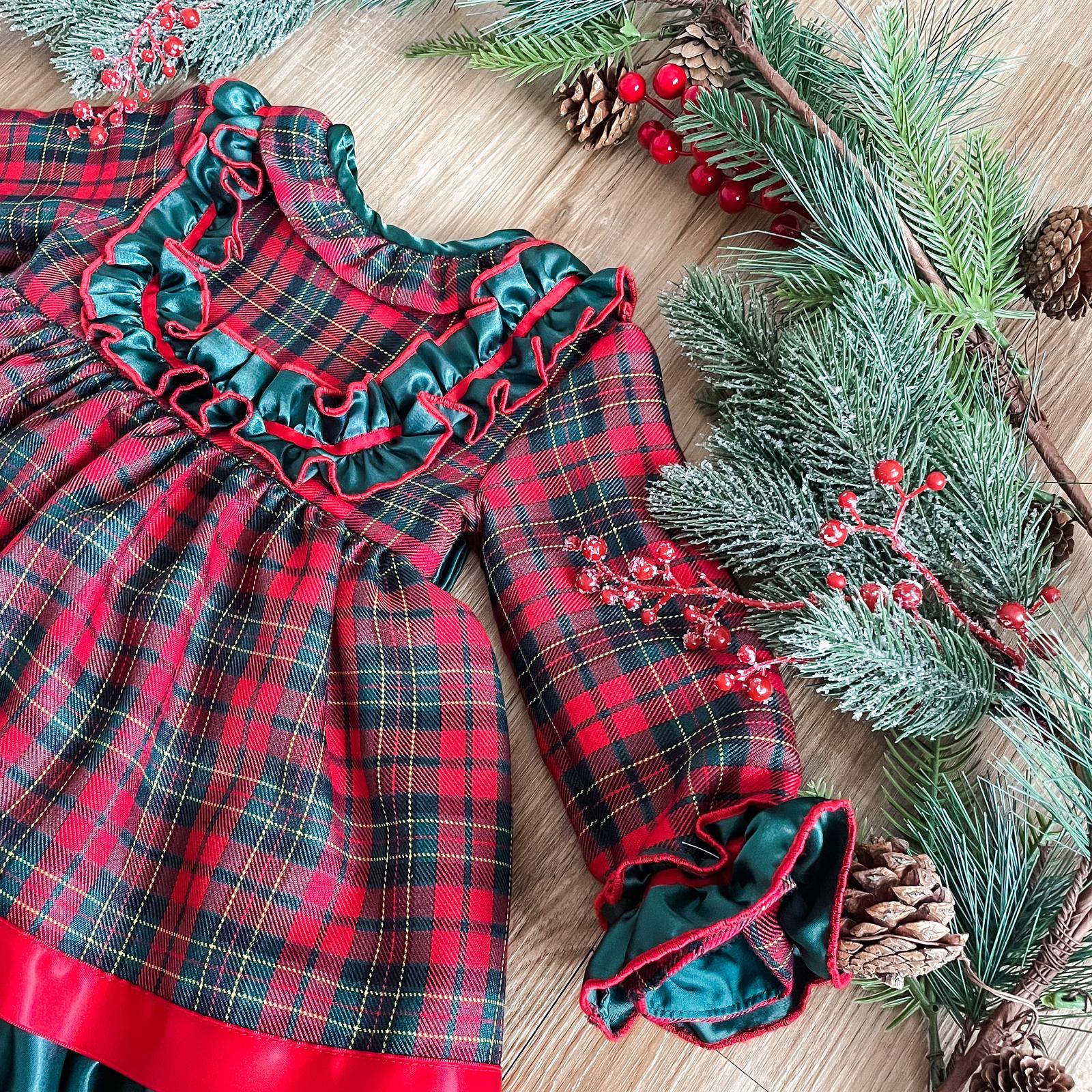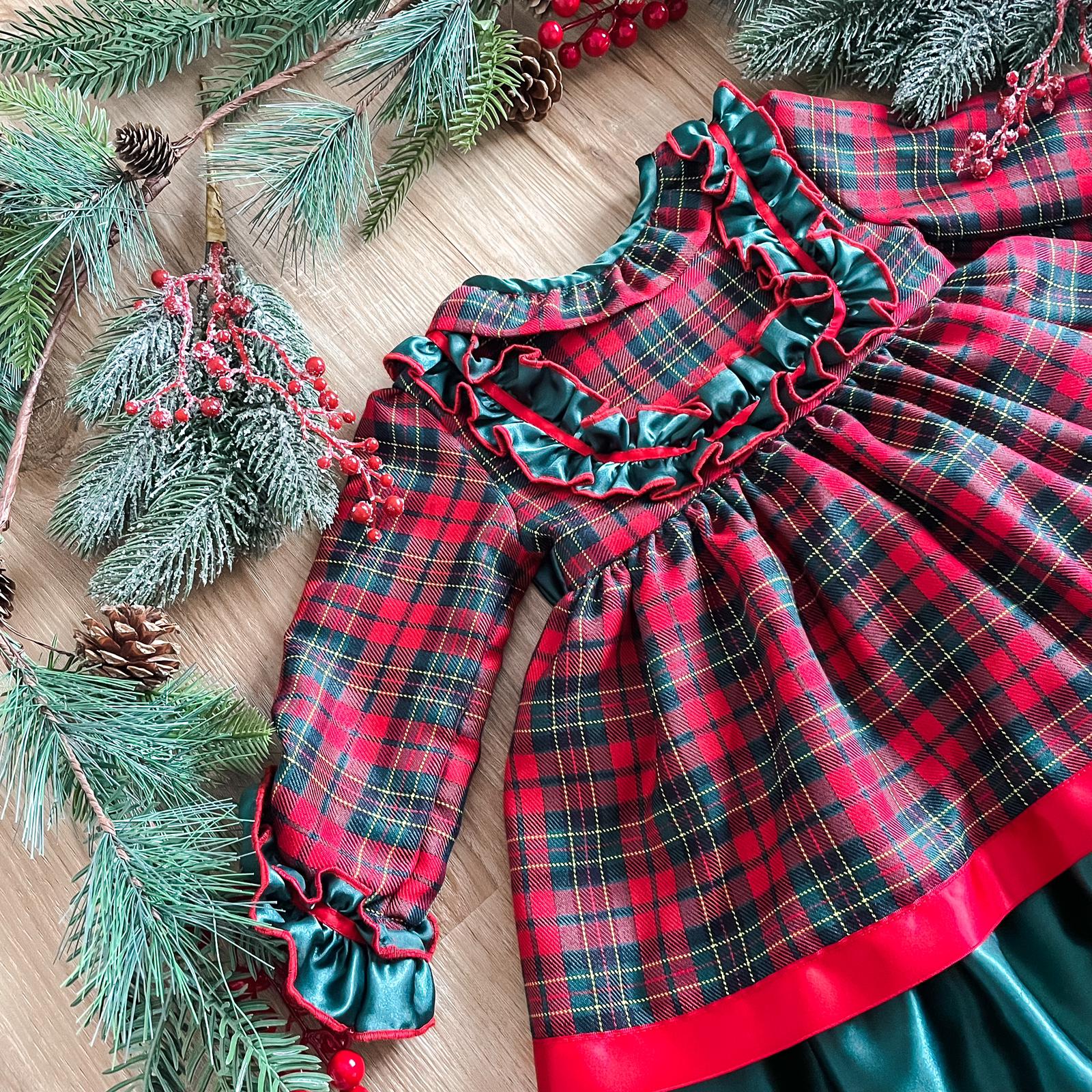What an incredible Christmas dress! The dress is a beautifully timeless tartan pattern; with tones of Christmas red and forest green. The bodice has a stunning forest green satin material, with red ribbon, decorating the front in a 'U' shape from shoulder to shoulder; the same wonderful materials decorate the cuffs on the sleeves.