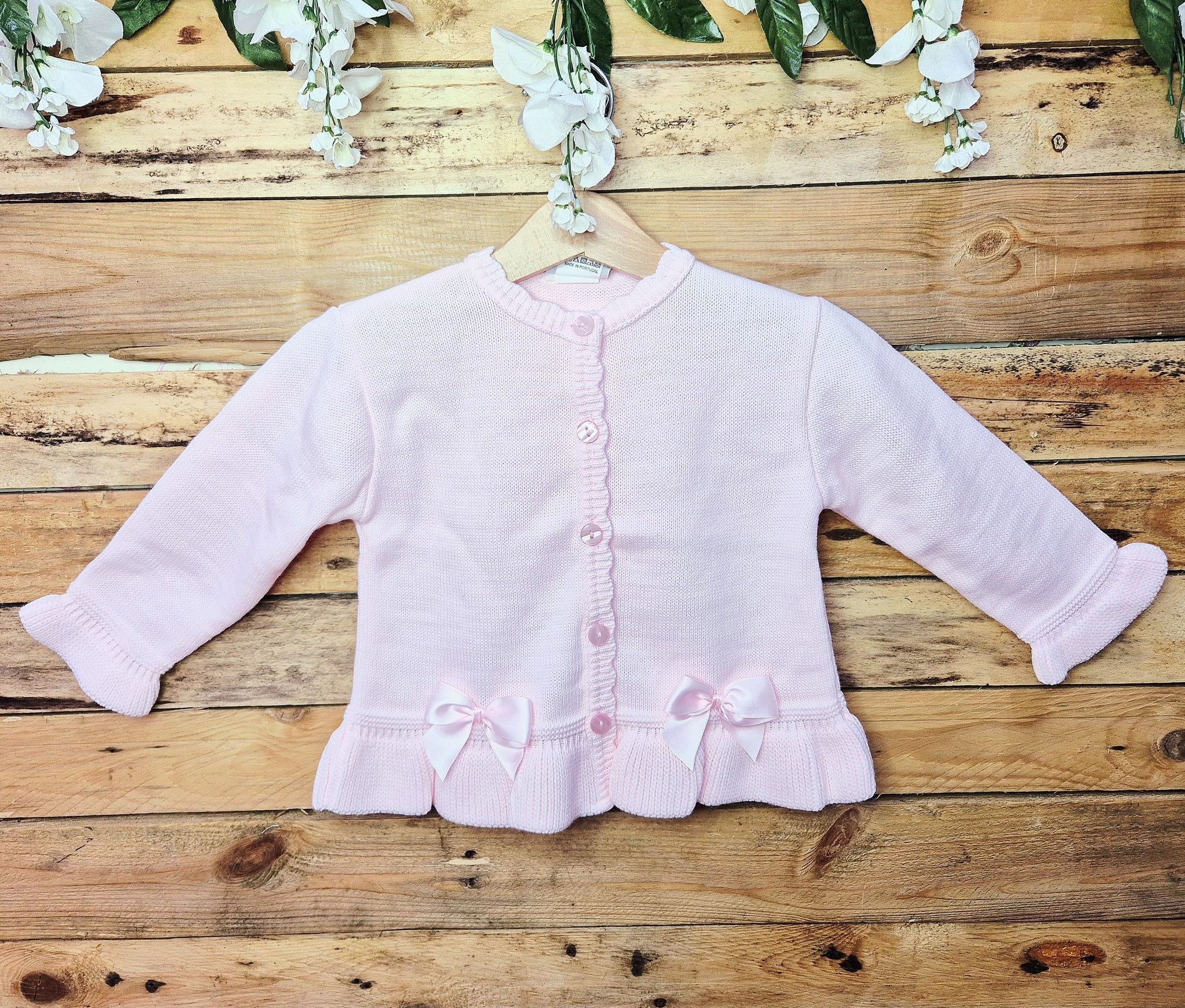 A lovely knitted Baby-Pink Cardigan ,from DANDELION, with 2 matching little satin bows at the waist, either side of the buttons.
