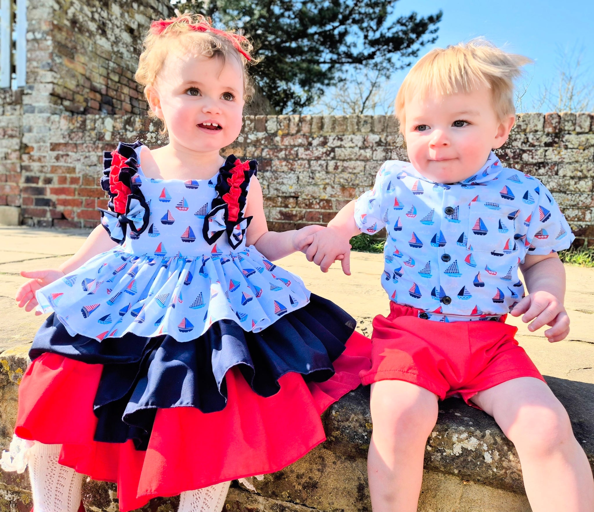 This stunning dress is made from the most gorgeous baby-blue sailing boat fabric, navy and deep red layered combination. The straps stop further down the bodice giving an added layer of detail; two boat print and navy bows sit either side bringing everything together!